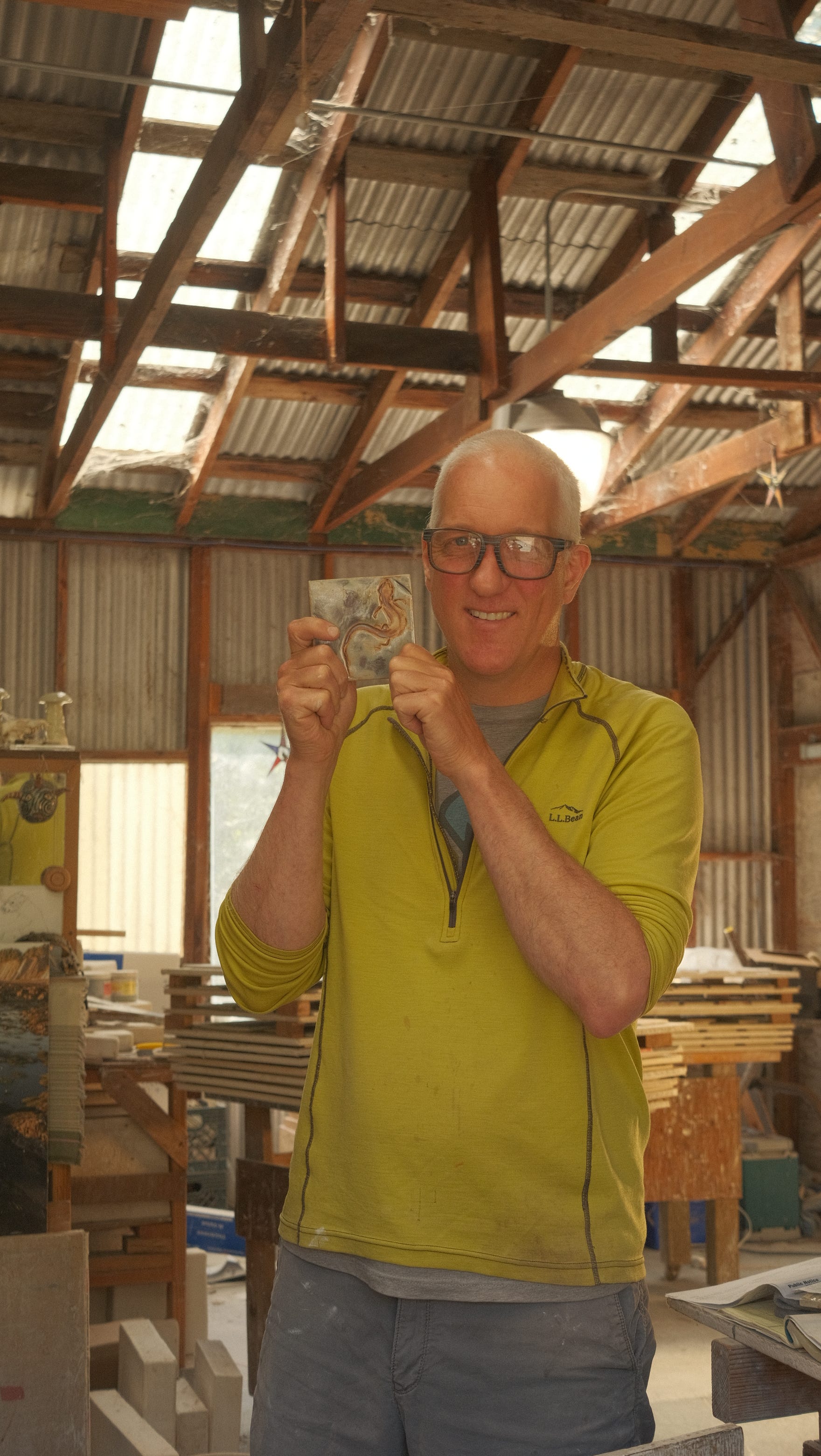 Matt owns Point Arena tiles, open most days. My graduate school work desk, made from the slab pictured above, is inlaid with Matt’s tile (pictured here). He pressed a real dead lizard into it to create that imprint.